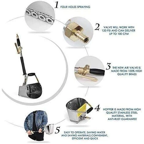 Le pulvérisateur à plâtre est fabriqué en acier inoxydable de haute qualité, non seulement solide sur le plan structurel, mais également garanti à vie contre la rouille. Il est léger et compact, vous pouvez donc le transporter avec vous.ce qui est très utile pour le plâtrage traditionnel. Machine de pulvérisation de béton à haute efficacité – Ce pulvérisateur de plâtre est un excellent outil pour accélérer votre processus de construction et économiser du travail! Vous pouvez l’utiliser avec des compresseurs d’air, du mortier en aérosol, du plâtre, du plâtre, du petit béton projeté, un mélange de terre et bien plus encore.OperationFonctionnement simple – Le pulvérisateur de gypse est très pratique à pulvériser en appuyant sur la poignée. Une pulvérisation peut pulvériser rapidement et uniformément sur le mur, économiser du temps et des efforts, économiser davantage d’eau et de matériaux de pulvérisation.