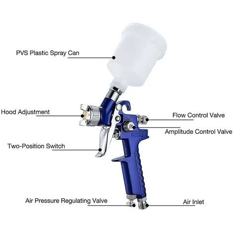[Haute qualité] Le couvercle d’atomisation est composé d’un matériau entièrement en cuivre, qui résiste à l’usure et améliore l’efficacité de l’utilisation de la peinture. La buse est en acier inoxydable, qui est trempé et résistant à l’usure pour une durée de vie plus longue et une meilleure étanchéité. [Pistolet à air] Pistolet de type HVLP. Une grande quantité d’air à basse pression est utilisée pour empêcher la peinture de se disperser, et une peinture efficace peut être obtenue avec une petite quantité de peinture. [Bouton de commande] Le bouton de réglage de la largeur de pulvérisation est antidérapant, ce qui vous permet d’économiser plus de peinture pendant le processus de pulvérisation. La pression d’air peut également être ajustée en fonction de vos besoins pour répondre à vos différents besoins de travail. [Conception à centre de gravité bas]La gâchette est douce et la conception améliorée du centre de gravité bas rend le contrôle plus flexible et réduit la fatigue du poignet. [Large gamme d’utilisations] Le pistolet pulvérisateur peut être utilisé pour l’entretien et la réparation de surfaces de meubles, la réparation de vêtements en cuir, la peinture murale, la peinture automobile, la peinture d’art, les arts et l’artisanat, la décoration en résine céramique, etc.Caractéristiques : 1. Pistolet de pulvérisation de précision polyvalent : l’effet d’atomisation uniforme et fin est très approprié pour l’entretien des meubles, la réparation du cuir, la peinture murale, la peinture automobile, la peinture d’art, les arts et l’artisanat, etc.