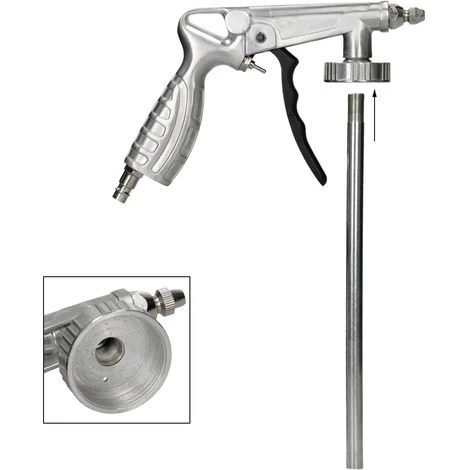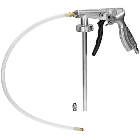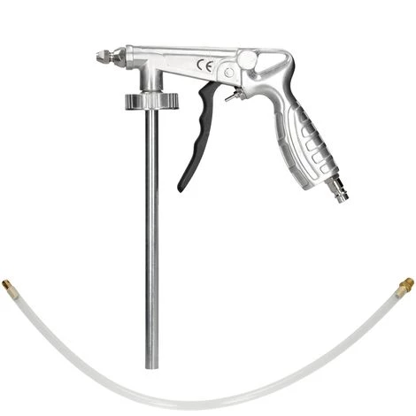 Pistolet à air comprimé pour la protection des dessous de caisse et la vitrification des cavités. Convient à toutes les boîtes et cartouches de 1 litre avec bouchon à vis disponibles dans le commerce. Le pistolet est livré avec une buse courte standard et un tuyau flexible de 50 cm avec une buse en éventail. Vous pouvez ainsi utiliser le pistolet pour les endroits difficiles d’accès (par ex. les cavités dans les bas de caisse).