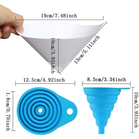 Entonnoir à filtre : taille extensible 10 x 8 cm, peut être plié à plat pour économiser de l’espace ; fabriqué en silicone de qualité alimentaire, 100 % sans BPA, résistant à la chaleur de -40 °C à 250 °C
