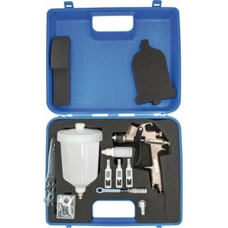 Le puissant pistolet de peinture alt-rond avec technologie HVLP, pour l’industrie et l’artisanat · pression de pulvérisation de pulvérisation max. 0,7 bar (pression d’interruption de la buse) · En raison des composants de buse en acier inoxydable standard, peut également être traitée recouvrant des revêtements, des charges et des amorces sur une base d’eau · Contenu: Pistolet de peinture (raccordement de l’air comprimé G 1/4 « ), Ø de 1,3 mm, coupe flottante 500 ml (plastique), jeu de pièces de rechange (joints et ressorts), clé de buse, ensemble de nettoyage, g 1/4 » Bouchon d’embrayage en acier, huile de soins Autres propriétés techniques: · Type de connexion: Mamelon d’acier
