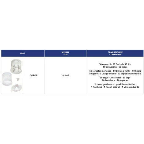 50 couvercles, 50 godets à usage unique, 20 bouchons, 1 flacon gradué