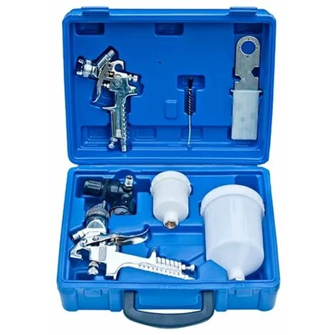 Contient :2 pistolets HVLP (1,4 mm et 0,8 mm), 2 récipients de couleur (à peu près 600 ml pour le grand récipient, 125 ml pour le petit pistolet),1 jauge,1 régulateur de pression,1 brosse de nettoyage,1 outil multifonctionnel,1 coffret de rangement