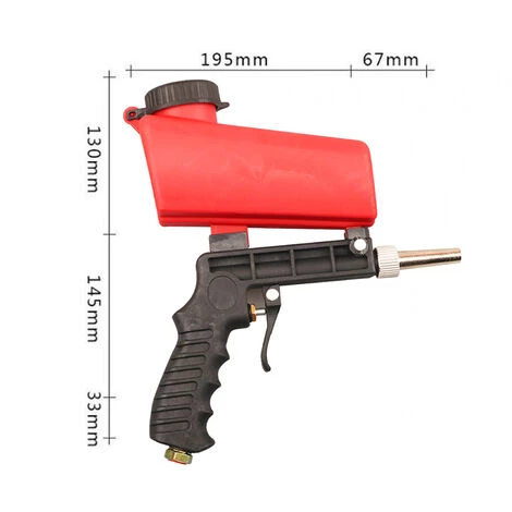 La sableuse à main est une prise d’air de 1/4 « et une pression d’air de 90 psi, le débit de sablage peut être ajusté. Il est utilisé pour toutes sortes de coins morts légers et petits en métal, le polissage par pulvérisation, les bavures, l’habillage de détail de retrait de rouille.