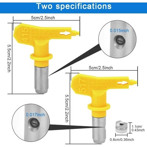 【Ensemble de buses sans air】 : vous obtiendrez 2 tailles différentes de buses de pulvérisation sans air réversibles. Les deux modèles sont 415 et 517, et il y en a deux pour chaque modèle. Chacun d’eux est équipé d’un joint de buse. Répondez à vos besoins de remplacement dans la vie quotidienne.