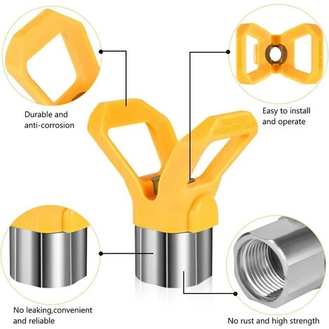 MATÉRIAUX DE HAUTE QUALITÉCes buses airless réversibles se composent de poignées en acier inoxydable 304 et d’orifices en carbure de tungstène. Sa tête est faite d’acier inoxydable et d’un coussinet de tête en nylon, qui est suffisamment étanche et résistant à l’usure pour vous permettre de le porter longtemps dans votre vie quotidienne.