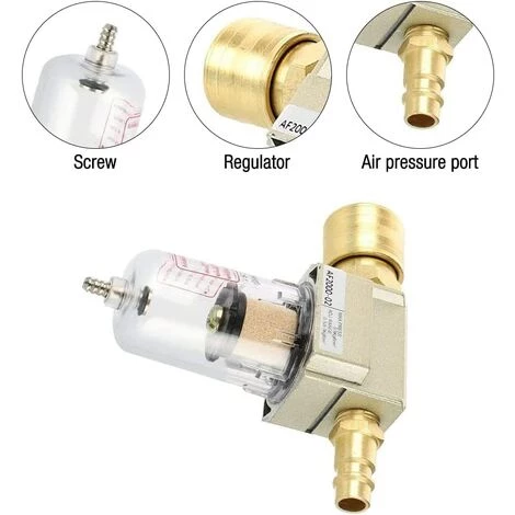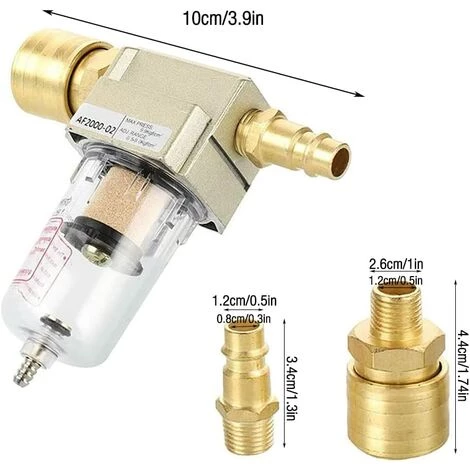 UNITÉ DE MAINTENANCE À AIR COMPRIMÉ – Le séparateur deau à air comprimé est une unité de maintenance efficace avec filtre séparateur huile / eau et raccord rapide allemand pour une utilisation sur les compresseurs, les outils de compresseur.UTILISATION – Séparateur dhuile de séparateur deau de filtre à air comprimé 1/4 BSP pour séparateur deau de compresseur Peut filtrer les petites particules, garder lair propre, lair comprimé qui circule peut éliminer la saleté et la condensation.MATÉRIAU ET APPLICATION DE HAUTE QUALITÉ – Le connecteur est en cuivre de haute qualité, robuste et durable. Lunité de maintenance dair comprimé convient à diverses occasions, pour connecter le compresseur ou la conduite dair comprimé, facile à installer.SPÉCIFICATIONS – La taille du séparateur deau du compresseur est de 10 * 10 * 4 cm / 3,94 * 3,94 * 1,57 pouces, filetage interne : 1/4 pouce.Couleur: OrPoids : 500g