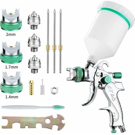 1. Pistolet pulvérisateur HVLP professionnel alimenté par gravité avec 3 buses de fluide, 1,4 mm, 1,7 mm, 2,0 mm. Vous permet de pulvériser une large gamme de revêtements et une variété de finitions de surface.